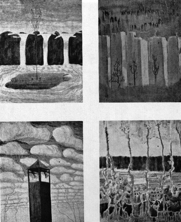 Perhaps the purest "abstract" creation of Čiurlionis are the eight paintings of the winter cycle, in which Čiurlionis portrays the manifestations of the elements of winter, i.e., winterishness itself, and not winter landscape. Nevertheless, the most graphically illustrative of the abstract quality of Čiurlionis' painting is the andante of his "Sonata of the Sun", which at first glance we are inclined to accept as a bold and impressive, almost geometric abstract composition. Upon closer viewing we see that the life-giving energy of the sun pierces space and the earth. That which we do not see but only comprehend or know only abstractly, Čiurlionis spreads before our eyes with a substantial and effective picture. Thus, essentially he is entirely different from the abstractionists, for he did not paint pictures which portrayed nothing. He did not occupy himself with abstract nature, but with only direct painting he tried to express that which Paul Klee much later formulated in words: "Now-adays we are concerned with reality rather than with the merely visible: we thereby express our belief that the visible realm is no more than a 'special case' in relation to the cosmos, and that other truths potentially have greater weight." 9
