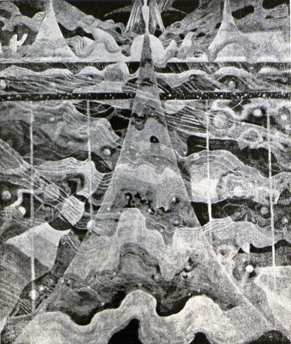 In the first place, Čiurlionis never abandoned content and did not leave a single painting which could be called non-objective or non-representational art. Then too, it is not correct to consider all or most of his work plastically weak. There are such, of course (we see in Čiurlionis' letters that he himself was not satisfied with all of his paintings) but which great master had ever been able to avoid weak results in his creative endeavors ?