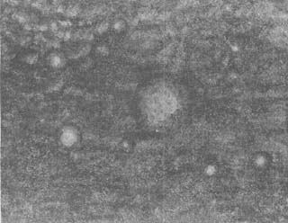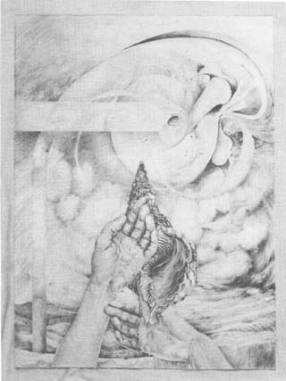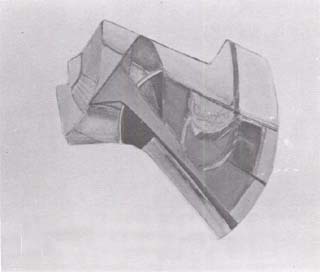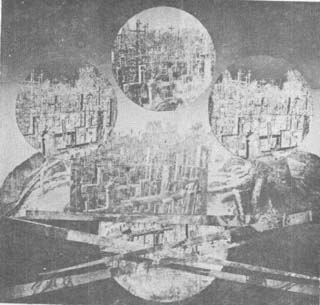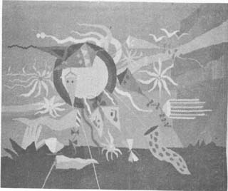 One's belief in the future and in the present becomes a composite of strong forms in the painting by Elena Kepalas. Her "Spaceship" could almost be an altar for the atoms. Deepest thoughts bring a trance-like vision or outer and eternal space in the colorful painting by Vytas Sakalas which traces star patterns for its construction. Otis Tamasauskas has presented a large eye-shaped piece of handmade paper. Fragile as a leaf it holds all the whirls of creation that could also be the forces of wind in a forest, a scene from the air, or a slice of the underground.