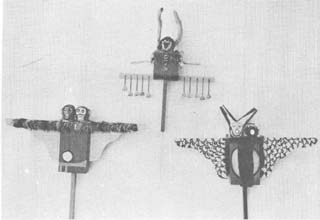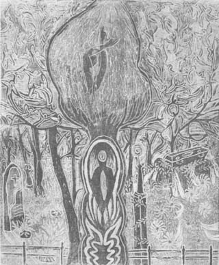 The triptych by Magdalena Stankūnas is delightful and fanciful interpretation of the life, death and the hereafter where the souls of the deceased are fantasy figures free of worry. The mystique and closeness of nature give Vanda Alekna a feeling of religious experience that she conveys in her triptych of powerful strokes of thick pigment. Symbolism utilizing abstract forms with contemporary techniques and brilliant colors in the painting by Laima Simanavichus conveys the dramatic representation of the crucifixion and resurrection of Christ. The crucifixion by Alfonsas Dargis has the immediacy of quickly drawn lines superimposed on ancient tribal shapes. One artistJonė Karuža reaches back to the early beginnings of religion where drama was used with masks and puppets. Her concept of light and dark ("seen" and "unseen") are thus presented as stick figures.