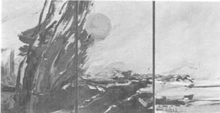 Juozas Mieliulis, Chicago, "His is the earth", 1974-86, oil on canvas, 30"x60"