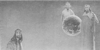 A finely drawn figure stands at the entrance of the gate of judgment in the picture by Leeka Gruzdeff-Kraucevičius. In its both hands the male figure holds good and evil. The God of Creation seems to have been surrounded by Thunder and Storm in the painting "The God of Thunder" by Vilija Alexandra Eiva who uses contemporary painting techniques to express ancient legend and movement. Quiet quality of personal feeling is transmitted m an emotional concept of the Christ figure crucified by Mykolas Paškevičius. He captures intense emotion with great simplicity. The seated God figure by Pranas Gasparonis is almost a chair sculpted in contemporary technique. The spirit of the Annunciation as a second sculpture by Gasparonis presents a powerful meaning with the simplest forms.