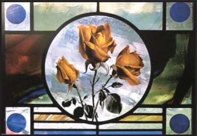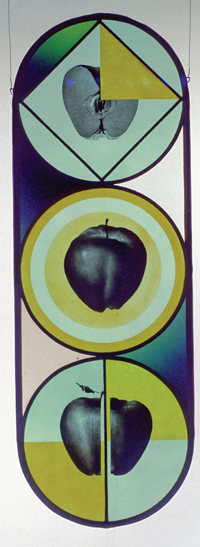 Albinas Elskus (1926 – 2007), whose name in Lithuanian was Bielskus, was not an ordinary artist in stained glass. He belongs to the generation of the 1960s that rediscovered Gothic Cathedrals and Tiffany glass and reinvented stained glass influenced by Art Nouveau and Art Deco. Stained glass makers were fascinated with the fresh possibilities of painted glass. In an age that pursued originality at all cost, Elskus achieved it with a medium rooted in tradition. He used stained glass not just for liturgical purposes, but also as a pure art form. Like some painters of the late Renaissance and a few in the neoclassical period, he was fascinated with still lifes, which he called “forbidden fruits”: apples, roses, and strawberries, all exquisitely painted on stained glass. His “Three Apples,” a masterpiece, is Albinas Elskus, ca. 1950 now part of the permanent collection of the Corning Museum. He had a passion for apples, which he liked to paint on glass, each time with a fresh, new approach. Called “Metamorphosis,” or “Spring,” or “Eclipse of the Sun,” his apples appeared in the semiabstract environment of stained glass artistry.