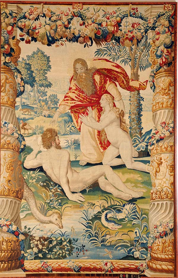 | The Introduction of Adam and Eve (from the tapestry set The Story of the First Parents). From the workshop of Jean (Jan) Leyniers, Brussels. After cartoons by Michiel I Coxcie (Coxie), mid-seventeenth century, 350 x 230 cm. From the collection of the Palace of the Grand Dukes of Lithuania. |