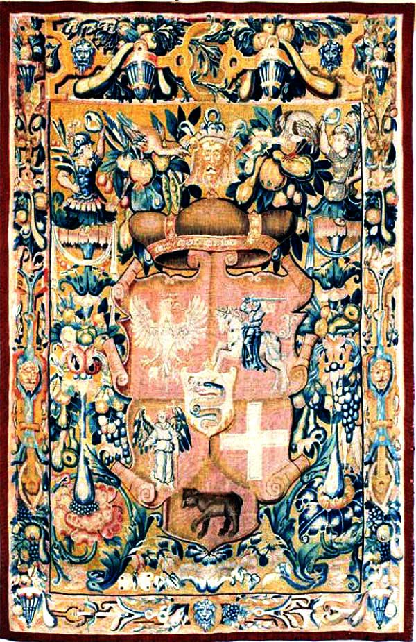 The heart of the coat of arms depicts98 the arms of Sigismund Augustus’s mother, Bona Sforza, daughter of the Herzog of Milan – a serpent swallowing a child. Woven in the first field is the Eagle of the Kingdom of Poland, the coat of arms of Sigismund Augustus’s father, Sigismund the Old (1506–1548), with the initials of Sigismund Augustus on the eagle’s chest. The second field has the armorial symbol of the Grand Duchy of Lithuania, the Mounted Knight (Vytis). The three coats of arms in the bottom fields are of the important lands of the Grand Duchy of Lithuania (The Angel represents Kiev; the Cross, Volhynia; and a Bear on all fours, Smolensk). Based on the interpretation of Dr. Edmundas Rimđa, this armorial composition could be read: The Grand Duke of Lithuania Sigismund Augustus is the son of the King of Poland and Grand Duke of Lithuania Sigismund the Old and Bona Sforza, the ruler of Lithuania and its lands (Kiev, Smolensk and Volhynia).