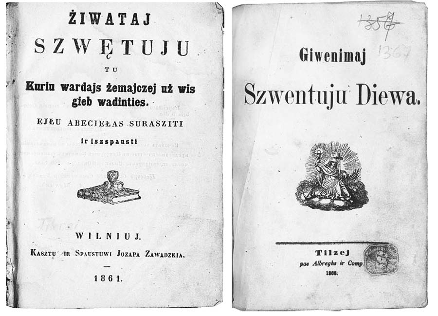 pages of Valančiuss Žyvatai šventųjų (1861; first edition 1858) and