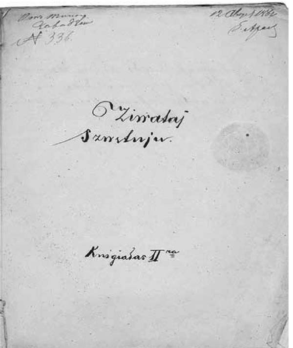 The manuscript ended up in the hands of the publisher Adomas Zavadzkis. This is evinced by the inscription made by the censor on the title page: От типогр[афа] Завадского ([Received] from the publisher Zavadzkis).14 The manuscript was at that point in the hands of a member of the Vilnius Censorship Committee, Viktoras Julijonas Aramavičius (18161892), who was the unofficial censor from November 23, 1857 to February 23, 1865.15 The title page bears the date 12 August 1864 Viktoras Aramavičius,16 written by him when he received the manuscript from Zavadzkis. The date on the fore-title page, 21 November 1864,17 is most likely the date when the manuscript was reviewed or returned to Valančius. Apparently, the manuscript did not receive publication permission, because it contains neither the censors approval nor any other marks characteristic of censored manuscripts, such as the censors signature, the special method of sewing the pages together, a seal, marks on the pages, or an indication of the publisher and the place of printing.18 It is doubtful that this was connected to the Lithuanian press ban, which had not yet taken hold everywhere by that date.19