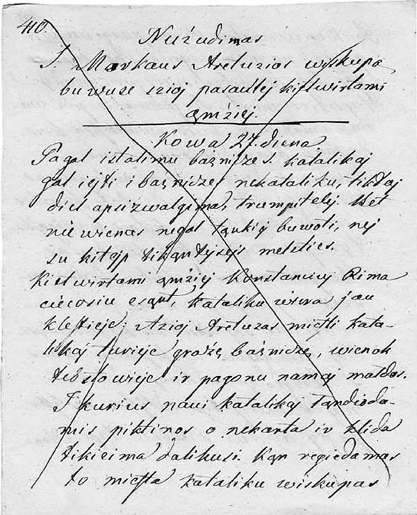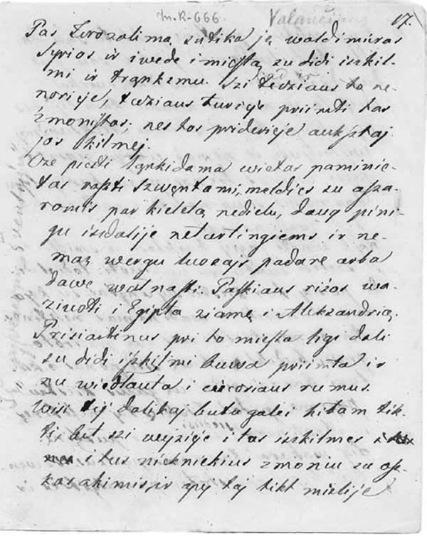 In light of the character of Valančiuss entire body of work, its scope, the number of books written and published, and also having the available autographs in mind, some comments can be made on his manner and method of writing. It should be noted that the manuscript of Darbai šventųjų is practically a clean copy, with very few corrections or amendments. It is likely that Valančius wrote the lives of the saints with a source or two in front of him after reading the life story of some saint, for example one by Skarga or another non-Lithuanian text, he immediately wrote down his own narrative. The story about the life of St. Mark from Arethusa contained in the autograph of Darbai šventųjų could confirm this supposition. Having written this story once, on pages 255259, Valančius described the life of this saint a second time, one hundred and fifty pages later (on pp. 410413). However, the second version is a completely different story. Only the structure of the texts and the main events from the life of the saint are the same; the vocabulary, expression, and dynamics of the narration differ.