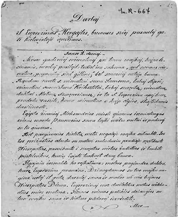 The manuscript of Darbai šventųjų is defective: it is unbound, has no title page, its beginning and some of its pages are missing,9 and it contains no indications of its history. The work is incomplete; the description of Gregory Nazianzens life abruptly ends on page 567. Judging by the paper, handwriting, the history of book printing,10 and a comparison to his later manuscripts Broma atidaryta į viečnastį (The Gate Open to Eternity), Pasakojimas Antano tretininko, and his other written works, it can be dated to 1874 or 1875. The copy of Darbai šventųjų is also defective: some of its pages and the title page are missing,11 and it likewise contains nothing that a researcher could use to definitively establish its history. The missing pages of the autograph most often do not coincide with those of the copy, so we practically have the whole text of the work.