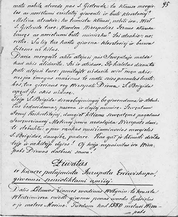 When Valančius noticed that he had related the life of St. Mark from Arethusa twice, he crossed out the second version. From this evidence, one can conclude that it was not a mistake made in copying a text, but rather an example of a completely spontaneous manner of writing. The spontaneity of Valančiuss writing, executed with minimal reliance on his own earlier texts or other authors works, is also shown by the fact that the lives of the saints in his hagiographical works had already been described in earlier books and manuscripts. Žyvatai šventųjų II includes a description of the life of St. Apollonia; Gyvenimai šventųjų Dievo includes St. Agnes; Darbai šventųjų St. James the Lesser and Leo the Great; all of these saints were described in Žyvatai šventųjų. In addition, Darbai šventųjų includes the lives of St. Bridget, St. Euphrosyne, St. James the Lesser, St. Mary of Egypt, and St. Peter Balsam, who had already appeared in Žyvatai šventųjų II. However, all these stories, just as in the example of the story of St. Mark of Arethusa, are markedly different from their earlier versions.